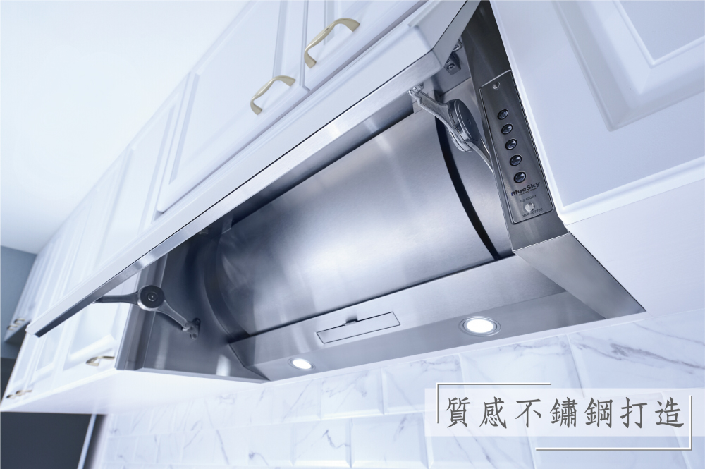 1. 請掀開門板,按下右邊開關分別是一檔,二檔、 三檔、 照明燈,即可啟動排油煙機。