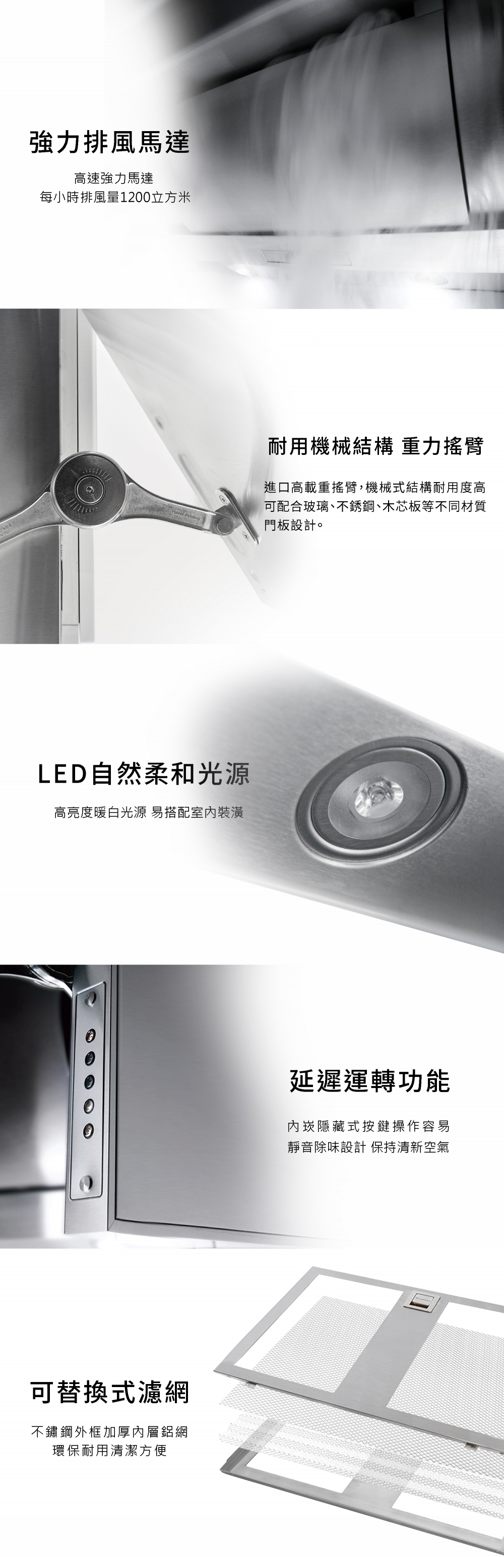 1. 請掀開門板,按下右邊開關分別是一檔,二檔、 三檔、 照明燈,即可啟動排油煙機。