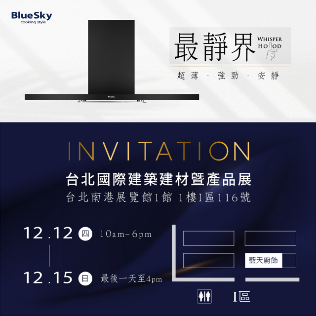 56年專業廚房設備品牌,這次帶來多項獨具特色的排油煙機設計,以及多樣符合開放式廚房的商品,藍天廚飾 BlueSky誠摯邀請您前來參觀唷