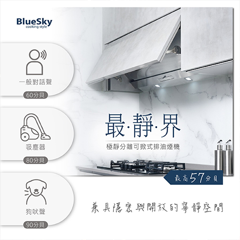 BlueSky #極靜分離可掀式排油煙機 特殊外型設計兼具隱藏美感、提升48%吸煙範圍,最高速噪音值僅57分貝。